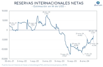 El fuerte ritmo de compras de contado que está llevando adelante el Banco Central permitió una recuperación de las reservas internacionales, tanto en el cálculo bruto como el neto. Las reservas totales o brutas alcanzaron este martes los USD 29.041 millones, un monto máximo desde el 29 de junio del año pasado. Las reservas netas, al descontar los préstamos y los depósitos privados, aún son negativas, en unos USD 3.147 millones, según estimó Aurum Valores. Hay que recordar que al asumir la presidencia Javier Milei el 10 de diciembre las reservas netas eran negativas en 11.651 millones de dólares.