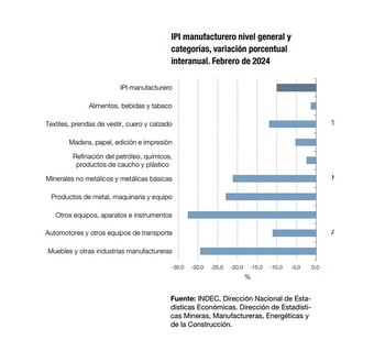 El organismo nacional también informó una caída del 9,9% en la producción industrial manufacturera. En febrero de 2024, quince de las dieciséis divisiones de la industria manufacturera presentaron caídas interanuales.
