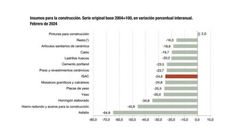 Las industrias metálicas básicas, por su parte, presentaron una baja interanual de 23,1% en febrero. Según la Cámara Argentina del Acero, las elaboraciones de productos laminados en caliente y de laminados en frío muestran caídas de 45,5% y 32,4%, respectivamente. Se refleja una baja interanual en la demanda por parte de los sectores de la construcción, automotor, de maquinaria agropecuaria y de los fabricantes de electrodomésticos. Con respecto a la actividad de la construcción, el Indicador sintético de la actividad de la construcción (ISAC) reflejó una caída de 45,9% en el consumo interno de hierro redondo y aceros para la construcción respecto al mismo mes del año anterior.