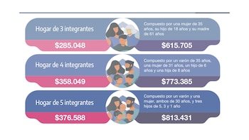 Así, un hogar de tres integrantes, conformado por una mujer de 35 años, su hijo de 18 años y su madre de 61, tendrá que destinar mensualmente $285.027 al pago de sus alimentos (Canasta Básica Alimentaria) y unos $615.705 al pago de la totalidad de sus necesidades (Canasta Básica Total).