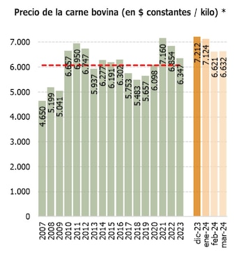 En el primer trimestre del año, el precio al consumidor de la carne vacuna promedió $6.792 / kilo (a valores de marzo) según el relevamiento mensual que realiza el IPCVA. Se trata de un número 10,9% mayor al del primer trimestre 2023 y 11,8% mayor al promedio de los últimos 17 años ($6.077).
