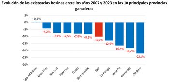 Los casos más impactantes se dan en Santa Fe, Corrientes y Córdoba, con rodeos que son hoy entre 16 y 22% más chicos que los que tenían en 2007, respectivamente. Un escalón debajo les sigue La Pampa, con un rodeo 13% inferior al de aquel entonces, y luego vienen San Luis, Formosa, Chaco y Buenos Aires, con pérdidas de entre 7,5 y 8,5% del rodeo, respectivamente.