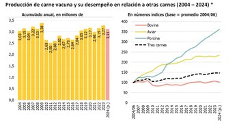 Es diferente el caso para la producción, que lleva 20 años sin crecer en Argentina. Los niveles de producción alcanzados en años recientes (2021/23) son en verdad muy semejantes a los de inicios de siglo (2004/06), con una tasa de crecimiento prácticamente nula en ese período (0,13% promedio anual), una dinámica que contrasta fuertemente con la que mostraron otras cadenas cárnicas durante similar período. “Para tener referencia, en paralelo al estancamiento vacuno, la producción de pollo y cerdo creció de manera casi ininterrumpida durante esos años (+5,3% promedio anual y 7,7% respectivamente)”, observó Artusso.