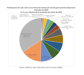 Por último, un cálculo del Instituto Argentino de Análisis Fiscal (IARAF) que encabeza Nadín Argañaraz en porcentaje y en millones constantes estima que $2.984 millones de reducción del gasto, o el 35%, se explica por el retraso en los aumentos de las jubilaciones y pensiones en plena aceleración de la inflación durante el primer trimestre.