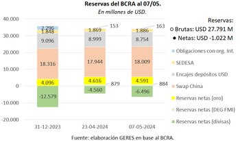 Un informe de GERES (Grupo de Estudios de la Realidad Económica y Social Pablo Barousse) indicó que al 7 de mayo último “las reservas netas del BCRA fueron negativas en USD 1.022 millones”, mientras que aquellas estrictamente líquidas “fueron negativas en USD 6.496 millones si se descuentan los USD 4.591 millones correspondientes a la tenencia de oro y otros USD 884 millones por DEG (Derechos Especiales de Giro) del Fondo Monetario Internacional. En tanto, las reservas totales (brutas) se situaron entonces en los 27.791 millones de dólares.