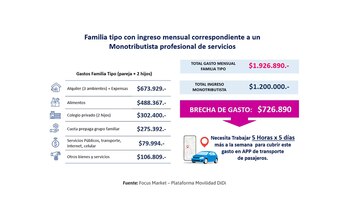 El caso 2 desarrollado por Focus Market es una familia tipo y el ingreso familiar proviene de un monotributista profesional de servicios con ingresos mensuales netos por $1.200.000 que trabaja hasta las 8 horas en su actividad. Dada la composición familiar, poseen similar gasto mensual que el correspondiente al caso previo, sólo que esta familia alquila un departamento de 3 ambientes en Parque Chacabuco cuyo valor, sumadas las expensas, es de $673.929. El total de gastos mensuales asciende a $1.926.890. Dados los mayores ingresos de esta familia, la brecha entre el dinero que genera y los gastos se reduce con relación al caso previo a -$726.890. Esta familia podría sumar $154.000 semanales si se incorpora a la app trabajando 5 veces a la semana, 6 horas por día, lo que le permitiría cubrir la brecha entre sus gastos y sus ingresos habituales.