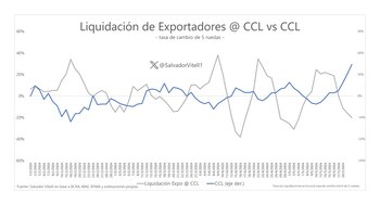 Se sabe, la brecha es enemiga de la liquidación y produce el efecto contrario a cualquier incentivo a liquidar. Con el dólar bordeando los $1.300, la brecha volvió a niveles de 50% lo que para el campo es un cartel de neón que indica “esperar” lo máximo posible antes de vender. Así, en las últimas 5 ruedas, la liquidación del agro anotó un retroceso en torno a 20% según las estimaciones del operador Salvador Vitelli, lo que se combinó o, mejor dicho, cuyo correlato fue el salto del tipo de cambio financiero (CCL)