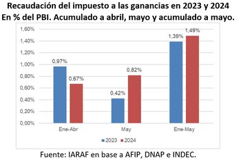 No obstante, la recaudación “extra” del mes de mayo, originada por el tributo a sociedades, sería de 0,47 p.p. del PBI. *Esto cambiaría el signo del acumulado del año, de manera tal que en los primeros 5 meses de 2024 se dé una suba de 0,1 p.p. de recaudación del tributo”, explicaron desde el Iaraf.