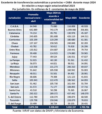 Teniendo en cuenta el mal desempeño que venían teniendo las transferencias automáticas a provincias y CABA hasta el mes de abril (-19% interanual real), resulta interesante evaluar los recursos extras que obtendrían las provincias en mayo. Es decir, en el mes de mayo de 2023 estos envíos resultaron un 15,6% mayor al promedio mensual real de los primeros 4 meses del año. Con lo cual, es posible obtener una medida de la plata extra que sumaron las provincias en mayo respecto al desempeño que hubiesen tenido si mayo se comportaba como en 2023. Siguiendo esta línea, el consolidado de provincias y CABA habría obtenido en mayo un excedente de $1.703.000 millones en moneda constante de mayo.