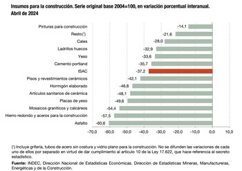 El sector de la construcción mantuvo la tendencia negativa en el cuarto mes del año. Según datos publicados por el Indec, el Indicador sintético de la actividad de la construcción (ISAC) se contrajo 37,2% en abril, en comparación con el mismo mes del año pasado. Así, el acumulado del primer cuatrimestre muestra una baja del 32%.