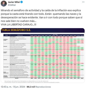 El presidente Javier Milei volvió a arremeter contra “la casta” al asegurar que la economía comenzó a mostrar signos de recuperación en mayo junto con una desaceleración de la inflación. Lo hizo al publicar en su cuenta de X un “semáforo” de actividad económica que exhibe que de los diez indicadores disponibles sobre mayo, cinco tuvieron números positivos.