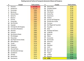 Mucho más abajo, en el otro extremo del ranking figura el Área Metropolitana de Buenos Aires (AMBA), donde la tarifa mínima sigue siendo de $270. Por supuesto, el sistema de transporte de la zona más poblada del país no es directamente comparable con el de otras ciudades mucho más chicas, como es el caso de Pinarmar o Centenario. La estructura es inmensamente más grande en el AMBA, así como la demanda por parte de los usuarios. No obstante, afirman desde Aaeta, el precio que pagan los habitantes de Buenos Aires está muy por debajo del punto de equilibrio que requieren las empresas de transporte.