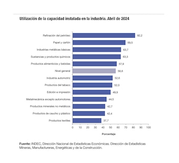 La utilización de la capacidad instalada en la industria se ubicó en 56,6% en abril, nivel inferior al del mismo mes de 2023, que fue de 68,9%, según un informe publicado por el Instituto Nacional de Estadísticas y Censos (Indec).