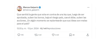 “¿Qué sentirá la gente que vota en contra de una ley que, luego de ser aprobada, suben los bonos, baja el riesgo país, cae el dólar, suben las acciones...? ¿En algún momento se replantearán que sus ideas son malas para el país?”, comentó el creador del unicornio de origen argentino en su cuenta de la red social X (ex Twitter) con un dardo dirigido a los legisladores opositores que no acompañaron la sanción de la Ley Bases.
