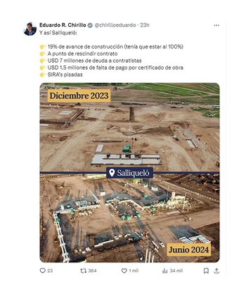 Asimismo, Chirillo publicó una segunda imagen, con el avance de obra de Salliqueló. Junto a la foto comparativa, advirtió que el Gobierno recibió el mando con el 19% de avance de construcción, cuando tenía que estar al 100%. A eso sumó que estaba a punto de rescindirse el contrato y se acumulaba una deuda de USD 7 millones a contratistas, más USD 1.5 millones de falta de pago por certificado de obra. Una vez más, denunció “SIRA’s pisadas”.