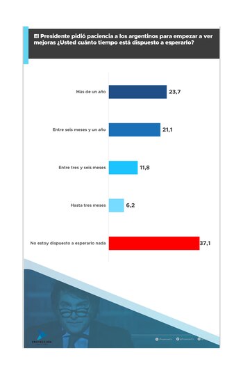 En cuanto a las opiniones sobre el rumbo de la economía el 38,6% cree que es el incorrecto y el 38,5% que es el correcto. No obstante, el 37,1% no está dispuesto a esperar nada como pidió el presidente Javier Milei para empezar a ver mejoras. El 23,7% dice que esperaría más de un año, el 21,1% entre seis y doce meses y el 11,8% entre 3 y 6 meses.