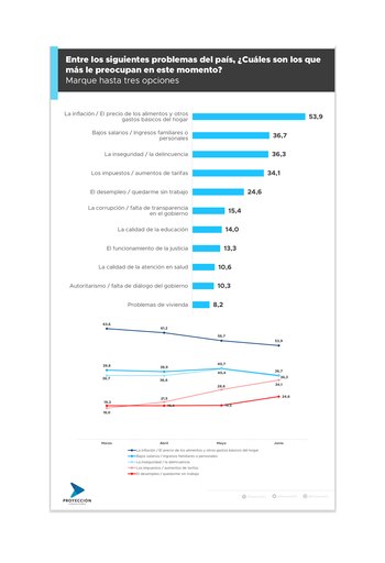 Por otra parte, si bien la principal preocupación sigue siendo la inflación y el precio de los alimentos y otros gastos básicos del hogar (53,9%), viene bajando desde marzo (63,6%). Asimismo, el 36,7% esta preocupado por los bajos salarios. Mientras tanto, subió la preocupación por el desempleo desde el 19,5% de mayo al 24,6% en junio y por la suba de impuestos y tarifas desde el 28,6% al 34,1%.