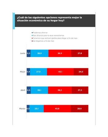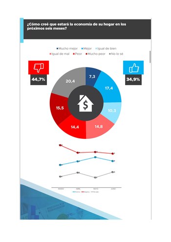Respecto a las expectativas sobre la economía del hogar para los próximos 6 meses, el 44,7% cree que empeorará, el 34,9% que mejorará y el 20,4% no sabe. El rumbo del país le genera incertidumbre al 40,8% de los encuestados, el 35,6% se mantiene optimista y el 23,7%, pesimista. Cabe destacar que respecto a mayo aumentó la incertidumbre y bajó el optimismo.