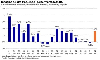 Dada la nueva postergación en el ajuste de las tarifas de energía anunciada para este mes, no serán los servicios públicos los que impulsen el índice a la suba. Sin embargo, la división de alimentos y bebidas parece haber recobrado impulso ya que en la primera semana del mes, al menos dos consultoras privadas que venían registrando mínimos movimientos en las semanas anteriores, detectaron un repunto mayor a 1,5% en la primera semana del segundo semestre.