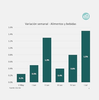 “Var. semanal de alimentos: 1,5%; proyección a nivel general de julio: 4,1 por ciento. La proyección responde a la postergación de los aumentos en gas y electricidad junto a la menor suba del impuesto al combustible”, sostuvo la consultora EcoGo en base a los resultados de su relevamiento semanal.