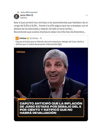 El presidente Javier Milei celebró los dichos de su ministro de Economía, Luis Caputo, quien había adelantado que el dato de inflación de junio que va a publicar mañana el Instituto Nacional de Estadísticas y Censos (Indec). La cifra, que se va a ubicar por debajo de los 5 puntos porcentuales, fue una oportunidad para que el mandatario atacara a las previsiones de los “econochantas” que, según sus dichos, preveían números más altos.
