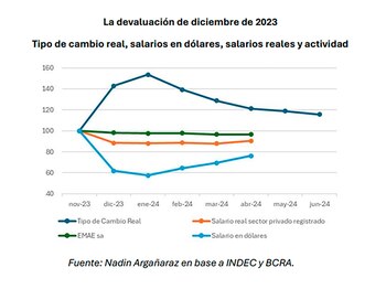 El informe, con la firma de Nadin Argañaraz, director del Iaraf, analizó 5 devaluaciones: la de principios de 2002, la de fines de 2015, la de mayo de 2018, la de agosto de 2019 y la de diciembre de 2023, enfatizando sus efectos de corto plazo sobre el nivel de actividad económica y sobre el salario real del sector privado formal.