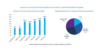 Con estos valores, en julio, la canasta de servicios públicos del AMBA ocupa el 15% del salario promedio registrado estimado del mes a la vez que el peso proporcional del gasto de cada servicio presenta valores similares para el transporte, la energía eléctrica y el gas natural.