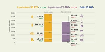 Por su parte, la venta de “combustibles y energía” tuvo un fuerte crecimiento del 26,8%, con USD 4.818 millones exportados. Si bien se trata del rubro con menor participación (12,6% sobre el total), su mejora contribuyó al superávit general.