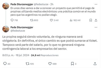 A esto agregó otro posteo en el que confirmó que el pago del adicional continuará siendo optativo. “La propina seguirá siendo voluntaria, de ninguna manera será obligatoria. En definitiva, el único cambio es que podrá sumarse al ticket. Tampoco será parte del salario, por lo que no generará ninguna contingencia laboral a los empresarios del sector”, apuntó el ministro.