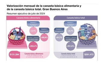 De esta manera, según informó el Instituto Nacional de Estadísticas y Censos (Indec), la Canasta Básica Total (CBT) acumula un incremento del 81,7% en lo que va del año, mientras que la CBA avanzó un 68,6%. En ambos casos la variación está por debajo del Índice de Precios al Consumidor (IPC), que acumula un alza del 87% entre enero y julio.
