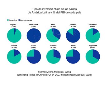 En América Latina, señaló Myers, China busca “descargar” parte de su sobrecapacidad productiva (respecto de su propia capacidad de absorción doméstica) y llevar a cabo estrategias de intervención económica, sea a través de crédito, adquisición de empresas ya existentes o inversión en nuevos proyectos, cada vez más selectivas. De hecho, un gráfico de un informe de Myers muestra, por caso, que en países como la Argentina, Bolivia, Guyana, Perú, y Surinam entre dos tercios y hasta 90 de sus inversiones son en actividades extractivas (ver arriba), aunque en pocos casos se trata de un aporte significativo en relación al tamaño de las respectivas economías. En el caso de la Argentina, precisa el gráfico, la inversión china equivale a apenas el 0,2% del PBI del país.