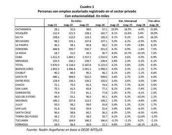 “En mayo el empleo asalariado privado formal cayó un 1,9% (125.000 puestos) respecto al mes de noviembre de 2023. Se destaca que Chubut, Córdoba, Jujuy, La Rioja, Neuquén y Salta llevan dos meses con mantenimiento o suba mensual del empleo privado”, destacó el informe del IARAF que señaló que al mismo tiempo que Neuquén, Salta y Tucumán fueron tuvieron crecimiento interanual, en el otro extremo, Formosa registró una caída del 18,1%, siempre de asalariados en el sector privado.