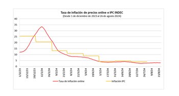 La tasa de inflación de los precios online que mide PriceStats hace tres meses que se mueve levemente por arriba del 3%. Paralelamente, la tasa de inflación medida por INDEC se ubicó alrededor del 4% hasta el mes de julio. Es muy probable que haya sido también del orden del 4% en el mes de agosto.