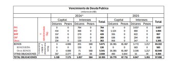 La reducción de la cuenta intereses obliga a llamar la atención sobre el tratamiento de la deuda del tesoro durante 2024 y lo que puede esperarse para 2025.El cuadro que se presenta a continuación muestra los vencimientos de la deuda en pesos y en dólares (medidas ambas en dólares al tipo de cambio oficial) para lo que resta de 2024 y para todo el año 2025.