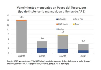 En medio del desafío que presenta este mes en materia cambiaria, dada la mayor presión sobre la demanda de dólares que se prevé por parte de los importadores tras la reducción del impuesto PAIS y la demora en acceder al mercado de cambios el mes pasado a la espera, precisamente, de esa baja impositiva, el equipo económico enfrentará un desafío adicional. A partir de la semana próxima deberá renovar los dos más altos vencimientos del año, que prácticamente triplican el monto del mes pasado ya que ascienden a un total de $14 billones. Una cifra similar, en tanto, se reparte entre octubre y diciembre.