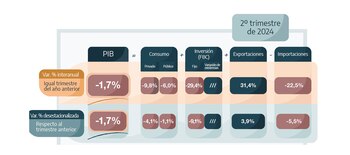 La serie original del PIB, en comparación con igual período del año anterior, mostró un descenso de 1,7% en el segundo trimestre del año. Entre los componentes de la demanda, el mayor descenso se observó en la Formación bruta de capital fijo, con -29,4% interanual (ia). También cayeron el consumo privado (-9,8%) y el público (-6,%). En tanto, crecieron 31,4% las exportaciones y cayeron 22,5% las importaciones.