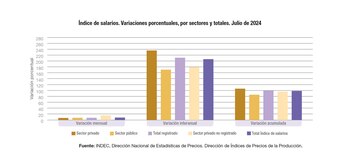 No obstante, no todos le están ganando a la inflación en el acumulado de los primeros siete meses del año. Según el Indec el Índice de Precios al Consumidor (IPC) avanzó 87% entre enero y julio, valor que supera por 2,1 puntos al incremento salarial de los trabajadores del Estado. Sí se mantienen por arriba de la inflación los trabajadores informales (sus sueldos aumentaron 95,4% nominal en el año) y los empleados del sector privado registrado (105,8%).