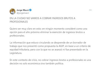 El cambio de postura fue anunciado por el jefe de gobierno de la Ciudad Autónoma de Buenos Aires, Jorge Macri, en su cuenta de la red social X. “En la Ciudad no vamos a cobrar Ingresos Brutos a profesionales”, encabezó su mensaje”.