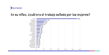 Entre las mujeres, el 14% soñaba de chica con ser profesora, el 11% con convertirse en médica, el 10% deseaba ser veterinaria, el 9% aspiraba a ser diseñadora y el 6% periodista y cantante. En la categoría de “otros”, destacan profesiones como contadora, maquilladora y maestra jardinera.