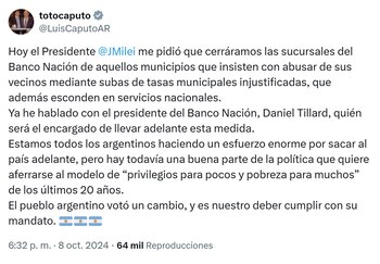 En concreto, el funcionario publicó: “Hoy el Presidente Milei me pidió que cerráramos las sucursales del Banco Nación de aquellos municipios que insisten con abusar de sus vecinos mediante subas de tasas municipales injustificadas, que además esconden en servicios nacionales”.