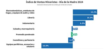 Tres de los seis rubros relevados registraron subas interanuales en sus ventas y en tres hubo declives. La mayor retracción ocurrió en Equipos periféricos, celulares y accesorios que descendieron 15,6% frente al año pasado. El que más creció fue Electrodomésticos, artefactos del hogar y equipos de audio y video (+12,1% anual).