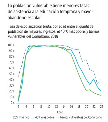 Estas brechas se amplifican en los barrios urbanos desfavorecidos. En el Conurbano, por ejemplo, un 31% de los jóvenes de 17 años no asiste a la escuela y el 13% de los estudiantes la había abandonado a los 15 años.