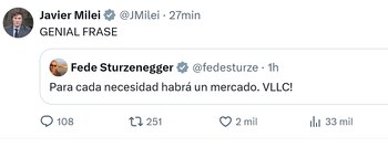 Justamente, poco después de ese tuit de Sturzenegger, el propio Milei replicó el mensaje agregando “Genial frase” para referirse a la chicana de su ministro.