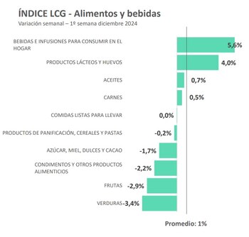 De acuerdo al informe, elaborado por la consultora LCG, la inflación de los alimentos, que había sido de sólo 0,1% en la última semana de noviembre, ascendió a 1% en la primera de diciembre. La suba, aunque parece discreta, le mete presión al Índice de Precios al Consumidor (IPC), que ha venido desacelerando en los últimos meses.