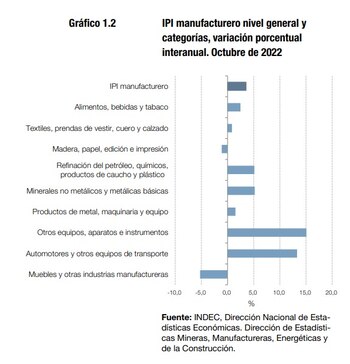 Pero al interior de la estadística, hay un dato interesante. En septiembre, el único rubro que superó el nivel del mismo mes del año pasado era, además del sector petrolero, el de alimentos y bebidas. Al mes siguiente, en cambio, se sumaron otros. Por caso, la industria automotriz, con una leve suba de 0,2% respecto del año pasado, edición e impresión, con una diferencia de 1,4 puntos, además de alimentos, que mejoró 10 puntos y el previsible rubro de refinación de petróleo, también casi 10 puntos por encima del año pasado.