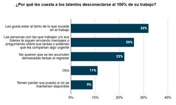 Entre quienes no logran desconectarse de su trabajo durante las vacaciones, el 32% menciona que le gusta estar informado sobre lo que ocurre en el trabajo; el 26% indica que sus compañeros y/o líderes continúan enviándoles mensajes o pidiendo que les compartan algo urgente; y el 22% lo hace porque temen que se acumulen demasiadas tareas al regresar.