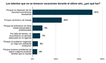 Entre quienes no tuvieron vacaciones, el 51% señala que la falta de recursos económicos fue la principal razón; el 25% lo atribuye a un cambio de empleo; y el 9% decidió priorizar otras metas personales o profesionales.