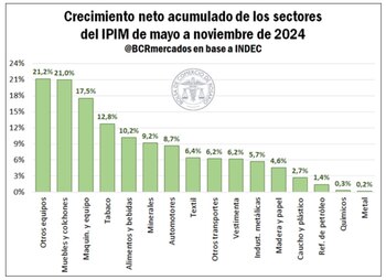 No obstante, teniendo en cuenta la incidencia de cada sector en la construcción del IPIM, el que más aportó a la recuperación del índice general es el de Alimentos y bebidas, dado que tiene el mayor ponderador (25%). El crecimiento de este sector entre mayo y noviembre de 2024 asciende al 2,5%, siendo que el IPIM registró en ese período un incremento total del 7,4%, resultado del aporte combinado de todos los sectores. “Al interior de esta rama productiva, este incremento se atribuye principalmente al crecimiento en la molienda de oleaginosas, que en noviembre registró un aumento interanual superior al 75%, más que compensando las caídas observadas en otras actividades, como la elaboración de gaseosas”, precisó la bolsa rosarina.