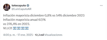 El Gobierno celebró el resultado y se mostró conforme con la evolución lograda durante el primer año de gestión. “Inflación mayorista diciembre 0,8% vs 54% diciembre 2023; Inflación mayorista anual 67,1% vs 276,4% en 2023″, escribió el ministro de Economía, Luis Caputo, en su cuenta de X.