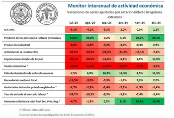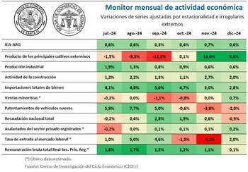 Según un informe del Centro de Investigación del Ciclo Económico, una iniciativa conjunta de las Bolsas de Comercio de Rosario y de Santa Fe, el nivel de actividad económica mejoró en el último mes del 2024. “La tasa de variación del Índice Compuesto Coincidente de Actividad Económica de Argentina (ICA-ARG) fue del +0,6% en diciembre A su vez, la tasa de cambio interanual se ubicó en terreno positivo (+2,2%) por primera vez en 14 meses”, remarca la última edición.